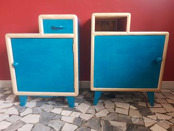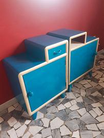 Coppia di comodini smaltati verde/ blu pavone con cornice oro chiaro, a due ripiani. Con cassetto uno, vano interno l'altro. Misurano : 52 largh x 32 prof x h. 68.