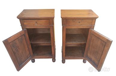 Corposa ed importante coppia di comodini Carlo X Emiliani, costruiti nella prima metà dell’Ottocento, in noce massello, integri ed in patina.