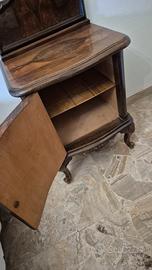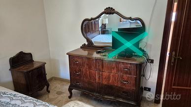 Coppia di comodini e relativo comò il legno, radica di noce probabilmente, con specchiera.