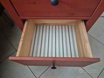 Vendo comodini Ikea serie Hemnes, rossi, non più in produzione in questa colorazione. Lieve scalfiture sul bordo dovute al normale utilizzo, a parte ciò in ottime condizioni. Dispongo anche di cassettiera stessa serie e colore in altro annuncio.