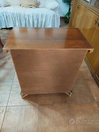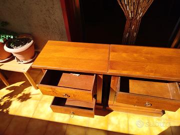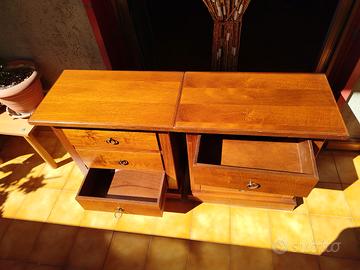 Coppia di comodini con struttura in legno finitura noce, solidi e stabili. Dimensioni: altezza 67 cm, larghezza 61 cm, profondità 36 cm. Ogni comodino è dotato di 3 cassetti capienti, con frontali in legno e maniglie ad anello in metallo. Buona scorrevolezza dei cassetti, adatti all’utilizzo quotidiano. Piano superiore ampio e resistente, ideale per appoggio lampade, libri o oggetti. Base con zoccolo che garantisce stabilità. Condizioni:ottime, struttura integra. Vendita preferibilmente in coppia si valuta anche vendita singola. prezzo leggermente trattabile