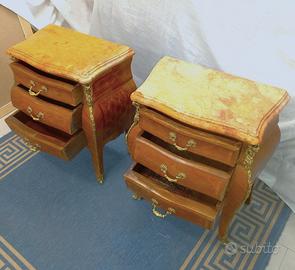 Splendida coppia di comodini mossi e bombati, in stile Luigi XV, risalenti al periodo Vintage (seconda metà del XX Secolo).