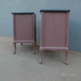Coppia di comodini mobiletti tavolini dotati di due cassetti ed un vano frontale, laccati e rifiniti con la tecnica “Shabby Chic” che prevede l’uso di colori chiari in superficie e colori scuri che affiorano dopo il trattamento d’usura. La struttura si presenta semplice ed armoniosa, e vanta proporzioni sapientemente equilibrate. La ricerca di un decoro mirato si riflette, in particolar modo, sulla scelta d’impreziosire il corpo con delicati intagli, caratteristici del gusto provenzale. Epoca seconda metà ‘900.