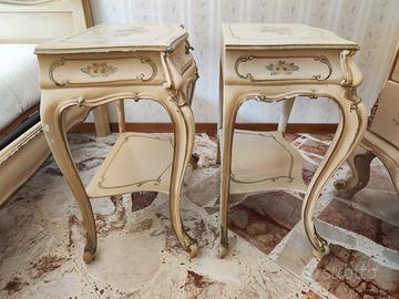 Vendo splendida coppia di comodini in stile veneziano/barocco, in legno laccato color avorio con decorazioni floreali dipinte a mano e dettagli dorati. Dotati di un cassetto e ripiano inferiore, con gambe curve scolpite.