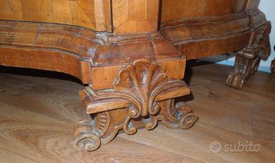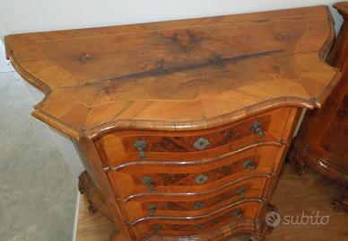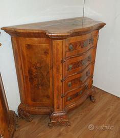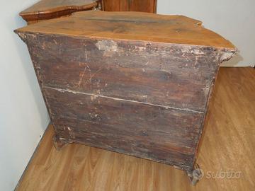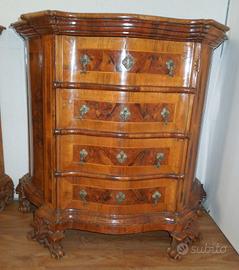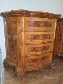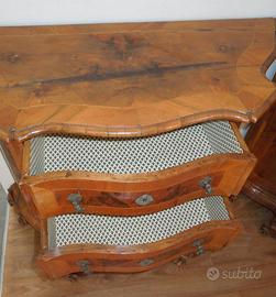 Coppia comodini antichi, stile barocco, in legno intarsiato. Restaurati
