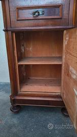 Vendo coppia di comodini gemelli degli anni '30, uno in buono stato e il secondo più rovinato. Le foto riguardano soltanto il primo, che ho spolverato e rinvigorito con olio paglierino. Il secondo viene ceduto in regalo, in quanto non quotabile, ma utile per chi ci vuol metter mano come restauro o come parti di ricambio del primo. Le rifiniture son buone e il legno non ha subito ammaloramenti, in quanto riposto in soffitta. Dimensioni: in cm, H 83 - L 52 - P 36. Come riscontrabile dalle foto il pianale in marmo risente -nella parte dietro, che si adagia al muro- di alcuni colpi, che in parte sembra lo abbiano scalfito. Vendo entrambi a € 80. Comprensibilmente non spedisco. Se occorressero altre foto, magari del pezzo più rovinato, sono a disposizione.