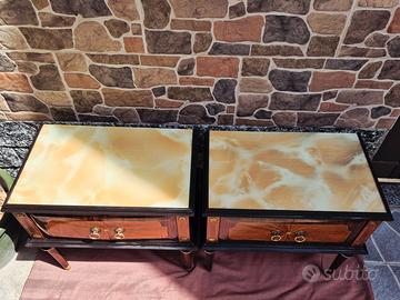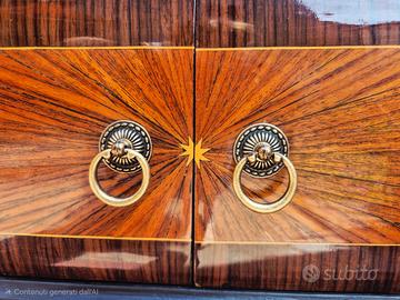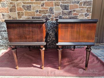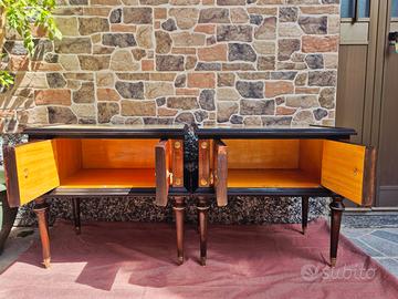 Vendesi splendida coppia di comodini originali degli anni ’50/’60, eccellente esempio di design Mid-Century Modern. I mobili sono stati oggetto di un accurato restauro conservativo manuale che ne ha esaltato l'eleganza senza stravolgerne l'anima vintage. Dettagli e Finiture: Top in Vetro: Piano originale in vetro retroverniciato con effetto onice/marmo ambrato. Una finitura tipica dell'epoca, molto scenografica e allo stesso tempo pratica e resistente. Ebanisteria di Pregio: Ante caratterizzate da un raffinato intarsio a raggiera. Al centro spicca un prezioso inserto a forma di stella in legno chiaro, realizzato con tecnica a incastro originale. Restauro a Cera: Lucidatura eseguita interamente con cera d'api. Questa finitura naturale dona al legno una brillantezza calda e una mano setosa, proteggendolo nel tempo. Dettagli in Ottone: Maniglie a anello e borchie decorative in ottone massiccio originali, pulite e lucidate a mano. Gambe a Spillo: Struttura slanciata con puntali in ottone, perfetti per alleggerire visivamente l'ingombro nella stanza. Misure: Larghezza: 60 cm Altezza: 55 cm Profondità: 36 cm Stato: Eccellente, pronti per arredare camere da letto di classe o salotti ricercati.
