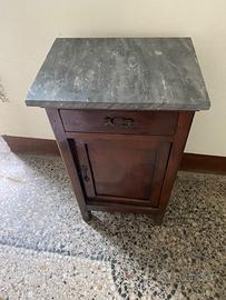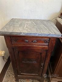 Vendo coppia di comodini d’epoca in legno massello, con piano in marmo originale. Entrambi i comodini sono in buone condizioni generali, con lievi segni del tempo che ne testimoniano l’autenticità e il fascino vintage. Dispongono di un cassetto superiore e un’anta con vano interno, arricchiti da eleganti intagli decorativi. Perfetti per arredare camere da letto in stile classico o come elementi d’arredo particolari per soggiorno o ingresso. Comodino con lavorazione frontale Altezza cm 83 Larghezza cm 41 Prondita cm 34 Altezza piedini cm 10 Comodino senza lavorazione Altezza cm 80 Larghezza cm 40 profondità cm 30 Altezza piedini cm 13 . Ritiro a carico dell’acquirente