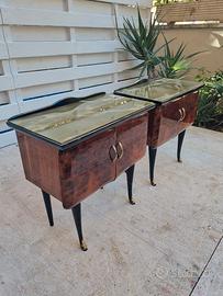 Splendida coppia di comodini originali anni '50 in pregiata radica di legno. Un esempio perfetto di artigianato italiano Mid-Century. Frontale bombato in radica con venature spettacolari. Piano in vetro originale con bordo sagomato. Alte gambe a spillo nere con eleganti piedini in ottone. Doppia anta con maniglie originali in ottone dorato. ♻️COSÌ È SE VI PIACE ♻️ *Il fascino del passato incontra il design del presente.* 🛣Via Vetulonia 39B Roma quartiere San Giovanni / Appio Latino 📌Dal lunedì alla domenica con appuntamento