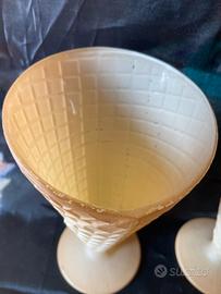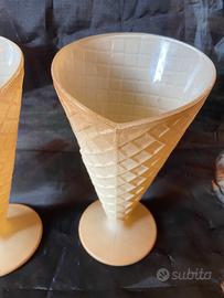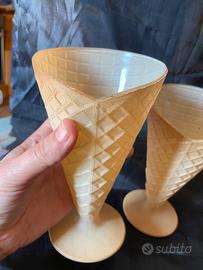 Coppia coppette in vetro a forma di cono, ottime condizioni, altezza 17 cm, diametro superiore 9,5 cm. Ideali per servire il gelato in un cono di vetro molto realistico.