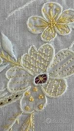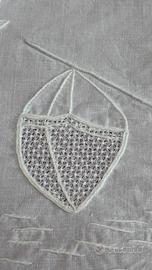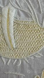 Coppia di copricuscini antichi: primi del '900. Sono ricamati a mano e in un ricco tralcio di fiori e foglie artisticamente ricamato, sono rappresentate delle casette e una barca. Paesaggio bellissimo, ideale anche per realizzare arazzi, quadri, tendine, mantovane o cuscini. Punti del ricamo difficilissimi, ormai scomparsi. Una vera opera d'arte. Uno dei due copricuscini ha un'imperfezione: vedi ultima foto, ma sono articoli che hanno piu di cento anni! Sono in cotone color panna, il ricamo è sui colori del panna e giallino. Misurano cm 74x 110. scrivetemi per altre foto e informazioni.