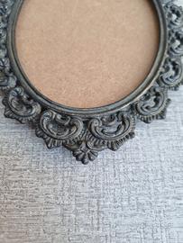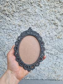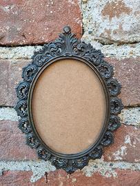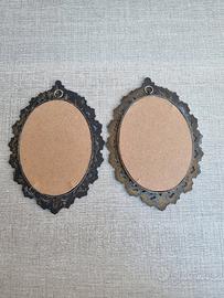 Coppia di cornici lavorate in stile liberty dalla forma ovale, con fondo posteriore in legno, vetro non presente. Ottime condizioni con qualche normale segno del tempo e qualche graffio. Gancio posteriore per poterle appendere. Misure esterne: altezza 17 cm larghezza massima misurata al centro 12.3 cm circa Misure interne Larghezza 8.3 Altezza 11.7 cm circa