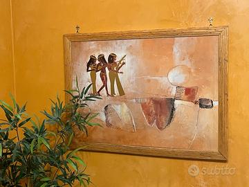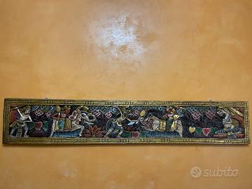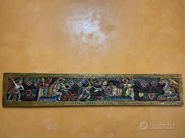 Descrizione: Vendo splendida coppia di decorazioni etniche perfette per arredare casa con stile caldo e originale. 🔸 Quadro stile egizio Dipinto decorativo con figure ispirate all’arte dell’antico Egitto, raffiguranti musicisti in stile stilizzato. Colori caldi (ocra, beige, marrone) e finitura materica che dona profondità e carattere. Cornice in legno. 📏 Dimensioni: 110 x 81 cm 🔸 Pannello in legno intagliato e dipinto a mano Bassorilievo lungo e riccamente decorato, con scene figurative e motivi tradizionali di ispirazione asiatica. Realizzato in legno, finemente scolpito e dipinto con colori vivaci. Pezzo molto scenografico e unico. 📏 Dimensioni: 197 x 35 cm ✨ Ideali per soggiorno, corridoio, studio o ambienti in stile etnico/boho. ✨ In ottime condizioni, pronti da appendere. 💰 Vendibili insieme o separatamente. Prezzo trattabile.