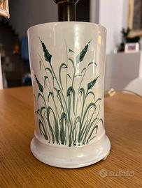Elegante coppia di abat-jour abbinate con base in ceramica smaltata decorata a motivi vegetali e paralumi in tessuto color beige con bordino rifinito.