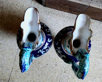 Elegante coppia di anfore manifattura Deruta di produzione dei primi del Novecento, con marchio alla base. Caratterizzate da una raffinata decorazione dipinta a mano con motivi di ispirazione rinascimentale. In perfette condizioni.