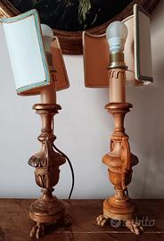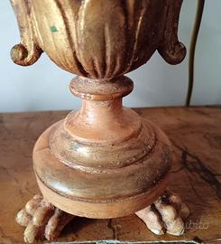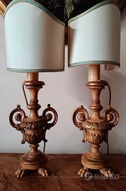 Una coppia di splendide lampade da tavolo, ideali per qualsiasi ambiente o da comodino, ricavate da due vasetti in legno scolpito, laccato e dorato della prima metà del 1700, terminanti con piedi ferini. La coppia, montata a lampada, è rifinita con ventole realizzate artigianalmente in seta avorio e passamaneria sui toni dell’azzurro e oro. Altezza completa: 62 cm La laccatura è originale, e riporta minimi segni dovuti al tempo. Nell’insieme sono conservate splendidamente. Non si vendono separatamente. La lampadina non è in dotazione.
