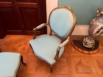 Coppia di antiche poltrone e pouf con struttura in legno dorato e tappezzeria in tessuto turchese stile Luigi XVI