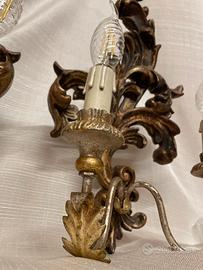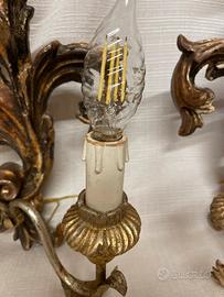 Ogni applique è dotata di due bracci elettrificati in metallo, con portalampada in legno effetto candela e piattini decorativi a forma di foglia. L’impianto elettrico è originale e funzionante, testato e mantenuto per conservare l’autenticità del pezzo.