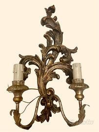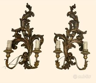 Coppia di eleganti applique antiche in legno scolpito dorato, recuperate da una chiesa sconsacrata e abbandonata nel Sud Italia, immersa in un borgo silenzioso, dimenticato dal tempo.