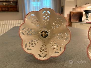 Coppia di applique in ceramica bianca decorata a mano in rosa chiaro, vendo per rinnovo bagno. Le lampade sono usate ma in perfette condizioni. Lampadine incluse. Diametro cappello traforato cm 17, profondità cm 15, diametro base di attacco cm 10,5. Braccetto snodabile ottonato.