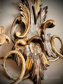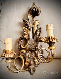 Coppia di Applique in legno antico a due luci di manifattura italiana stile liberty in legno finemente intagliato con patina foglia argento e particolari oro risalente alla metà del secolo scorso.