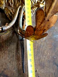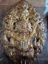 Coppia di Applique in Portapalme fine '600 Inizio 700 in Lamiera Dorata, originali della fine del XVII/inizio del XVIII secolo, disegnati con un alto rilievo di fogliame e grandi teste di girasole. Struttura originale in ferro sul retro. Queste appliques sono realizzate a mano in ottone e sono state originariamente create per le chiese di tutta Europa; dovevano contenere le candele per illuminare l'edificio. Storicamente sono stati elettrificati nel XIX secolo. I bracci della lampada sono decorati con foglie d'acanto a scorrimento.