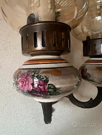 Vendo due applique da parete identiche, funzionanti, in ottone, ceramica decorata e vetro ambrato.