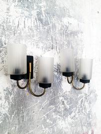 Coppia di appliques nello stile di Stilnovo o Arredoluce. Ottone e lamiera verniciata in nero. Paralumi in vetro bachettato opaco. Funzionanti con naturale patina del tempo. Montano lampadina E14.