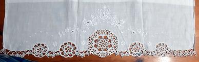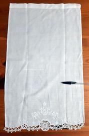 Vendo set di due asciugamani bianchi in lino, mai usati, vintage. ricamati a mano e bordo in pizzo chiacchierino, piega con punto giorno. il piccolo presenta piccolissima macchiolina indicata da punta penna evidenziata in foto 3/4 e difetto di tessitura poco sopra.