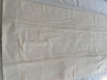 Coppia di asxiugamani in spugna bisnconoanna, viso e ospite. Uno dei lati corti ha un bel bordo in tessuto con fantasia blu notte e panna. Asciugamano viso cm 100 x 60, ospite cm 60 x 40. Ovviamente nuovi, hanno il segno delle piegature.