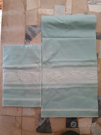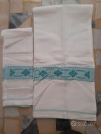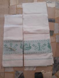 6 Coppie di asciugamani in lino artigianato sardo ricamo pibiones tipico della Gallura misure grande 120 x 55 piccolo 70 x 40 colori prezzo per ogni coppia, colori bianco, ecru, verde acqua, giallo, sfondo verde con ricamo bianco