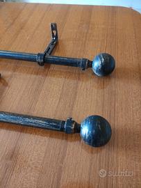 Due bastoni per tende di ferro colore nero con sfumature in colore oro con effetto antichizzato. Dieci anelli per ciascun bastone. Regolabile. Il prezzo è per entrambi. Misura chiuso 120 cm. Misura esteso 220 cm. Consegna a mano.