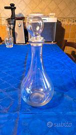 Set di 2 bottiglie di vetro con tappo, delle quali una decorata in rilievo.