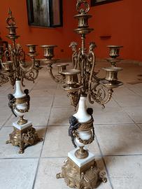 Vendo coppia di candelabri antichi in bronzo e marmo, riccamente decorati, 5 bracci + fusto centrale ciascuno.