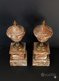 Coppia di cassolette ornamentali francesi in marmo e ottone probabilmente di epoca e stile Napoleone III o della fine del XIX secolo.