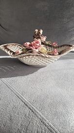 Bellissima coppia di cestini in pregiata ceramica artistica italiana, realizzati interamente a mano con la tecnica del traforato intrecciato. Caratterizzati da delicate decorazioni floreali (rose in rilievo) e dipinti con motivi botanici all'interno.