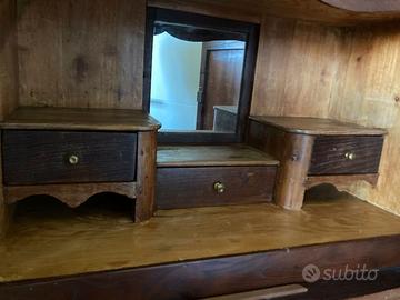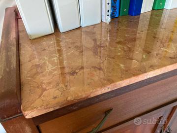 Piano di appoggio in granito rosa, ricami in legno multicolore. Legno in buone condizioni, assenza di tarli. Difetti: - mancanza chiavi - necessaria verniciatura in alcune parti - uno dei comodini ha il pannello posteriore forato