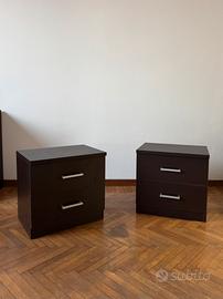 Coppia di comodini in legno marrone scuro con due cassetti dal design minimale. 40€ un comodino 65€ due comodini dimensioni 52cm larghezza 38cm profondità 50cm altezza ritiro a milano
