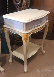 Coppia di comodini in noce massello anni ' 60 dipinti finemente con smalti effetto chabby colore lilla, oro e color burro.