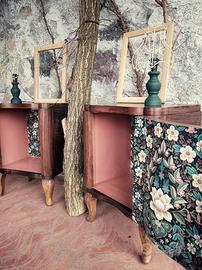 L'esterno è alleggerito dal contrasto di essenze e da una finitura a cera lucida.