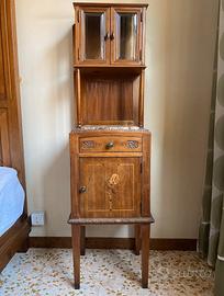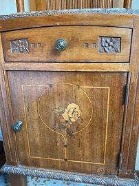 Coppia di comodini originali di inizio ’900 in legno massello, stile Liberty, impreziositi da delicati intarsi floreali sul fronte, tipici della produzione artigianale dell’epoca.