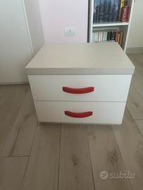 Vendo coppia di comodini dal design moderno e versatile, ideali per camerette o camere da letto vivaci. La struttura è solida, con finitura bianca e top superiore in effetto legno chiaro.