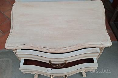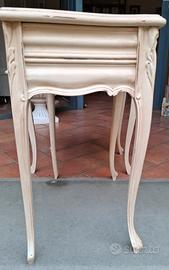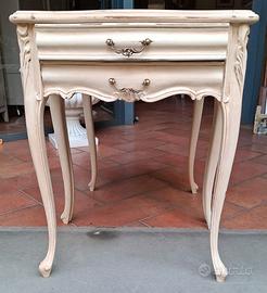 Coppia di comodini/ tavolini d'appoggio in stile shabby chic, ideali per donare un tocco di eleganza provenzale alla vostra camera da letto o al vostro soggiorno. Caratteristiche: Stile vintage: design classico e raffinato con gambe curve a sciabola e dettagli intagliati: verniciati in una calda tonalità color Dèlicè e anticati con una tecnica a cera scura che ne esalta la lavorazione e crea un effetto invecchiato autentico , ogni comodino è dotato di due cassetti con eleganti maniglie. Perfetti per: Chi ama lo stile shabby chic, provenzale o rustico chic. Creare un'atmosfera romantica e accogliente. Misura: H.60cm, Prof:35cm, Larg:52 cm. Disponibili alla spedizione con prezzo della spedizione da valutare.