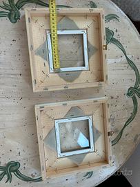 Due cornici bianche con fondo in tessuto, dallo stile raffinato e moderno, perfette per valorizzare foto, stampe o piccoli oggetti decorativi. Possono essere appese o appoggiate, ideali per arredare con gusto salotti, camere da letto o studi.