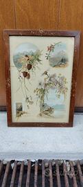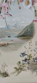 Coppia di cromolitografie svizzere, fine '800 — Flora alpina e vedute lacustri Coppia di stampe cromolitografiche di grande qualità raffiguranti composizioni di fiori alpini intrecciati con vedute paesaggistiche svizzere: il Lago di Lowrz (Lowerzersee, Canton Svitto) con le Alpi sullo sfondo, e una veduta dal Rigi verso l'Urirothstock e il Bristenstock con il Castello di Chillon. Didascalie in tedesco. Retro con carta decorata a gigli di Borbone originale d'epoca. Tecnica cromolitografica di alta qualità, tipica della produzione editoriale svizzero-tedesca di fine Ottocento (stile Jugendstil nascente). Tecnica: cromolitografia su carta Cornici: legno scuro originali d'epoca (con usura) Dimensioni indicative: circa 28×40 cm (stampa), 33×46 cm (con cornice) Condizioni: buone per l'età — normali segni del tempo sulla carta e soprattutto sulla cornice. Vendute come coppia abbinata. prezzo trattabile