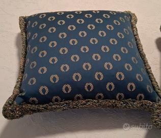 Stupenda coppia di cuscini arredo in tessuto colore blu. Profilo con passamaneria colore giallo/oro e blu.
