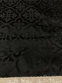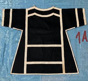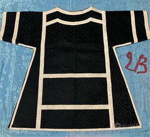 Coppia di dalmatiche in damascato di cotone nero e gallone di cotone. Integre, complete di accessori. Chiusure con alamari. Fodere integre e ottima rigidità, sicuramente mai indossate.