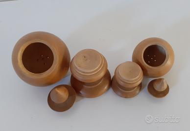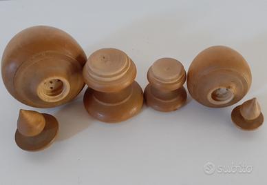 Coppia di vasetti in legno tornito, profumatori per ambienti. Risalgono agli anni '70/'80. Ogni oggetto si compone di base, corpo e puntale separabili. Il corpo funge da contenitore per petali essiccati, resine, pot-pourri, trucioli di legni profumati o imbevuti di oli essenziali. La parte traforata tra il corpo e la punta permette di far uscire gradualmente il profumo ed è tipica dei "pomi aromatici" della tradizione alpina. Il puntale ha una funzione estetica e serve a chiudere il contenitore o per limitare la diffusione dell'essenza. Dimensioni: vasetto grande: altezza 16,5cm diametro massimo 8cm peso 200gr vasetto piccolo: altezza 12cm diametro massimo 6cm peso 75gr Pagamento contanti alla consegna, Ferrara zona Marfisa. Vendita tra privati; questo oggetto è venduto come materiale di seconda mano, pertanto è esplicitamente esclusa ogni garanzia.