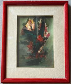Opera con tecnica ad olio su supporto rigido (cartoncino telato), caratterizzata da pennellate dense e contrasti cromatici (verdi profondi, rossi e terre) in stile astratto-espressionista anni ‘80. I due dipinti rappresentano una natura morta di fiori stilizzata.