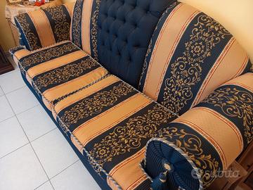 divano tre posti + divano due posti, colore blu e giallo in stile classico, in buone condizioni .